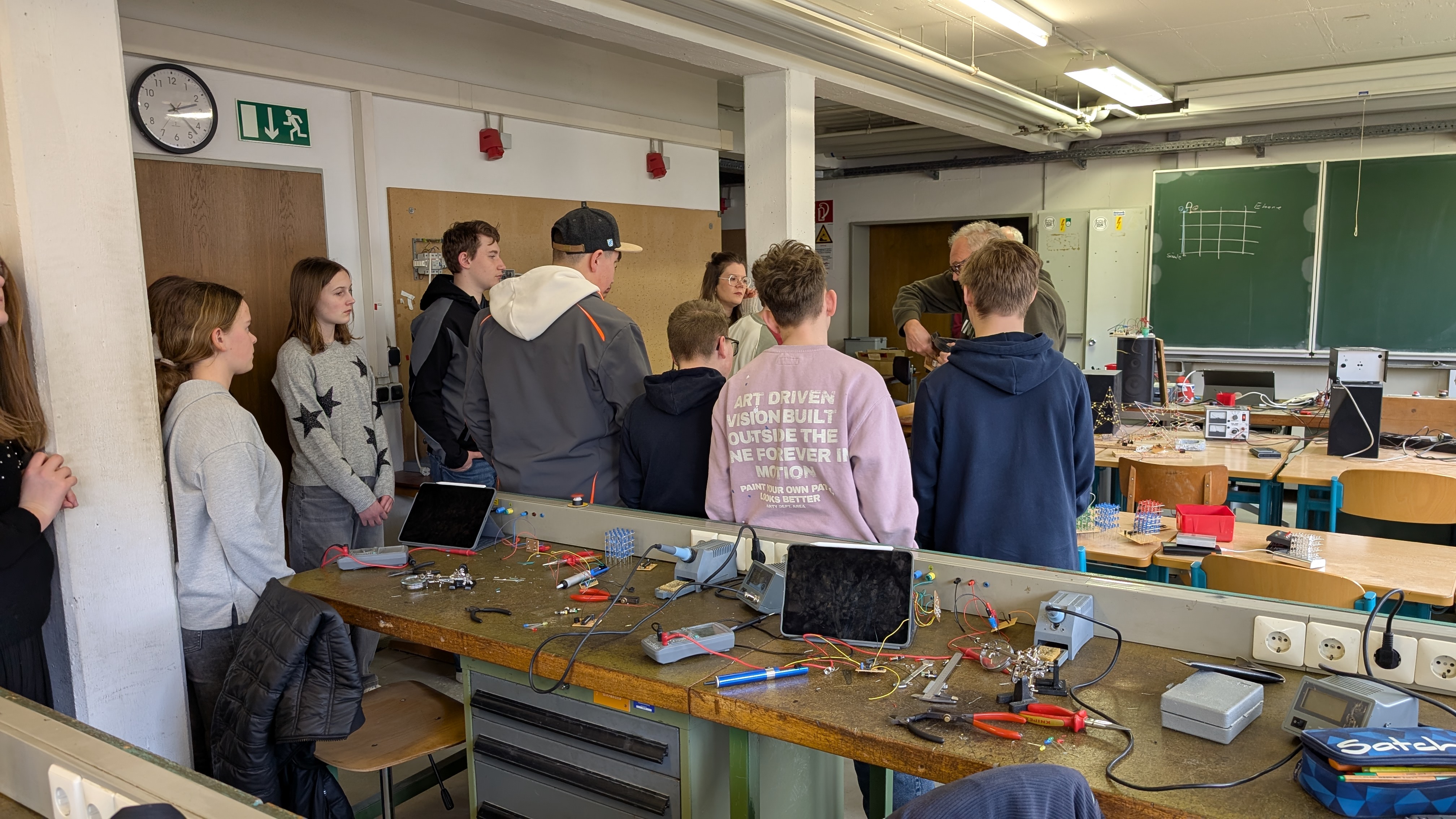 Herr R. Gall, Meister der Werkstatt, nahm uns in Empfang und wir konnten den Schülern während IhrerPraxisarbeit zusehen. Die Werkstatt der Elektrotechnik wurde uns von Herrn E. Tahedel gezeigt.