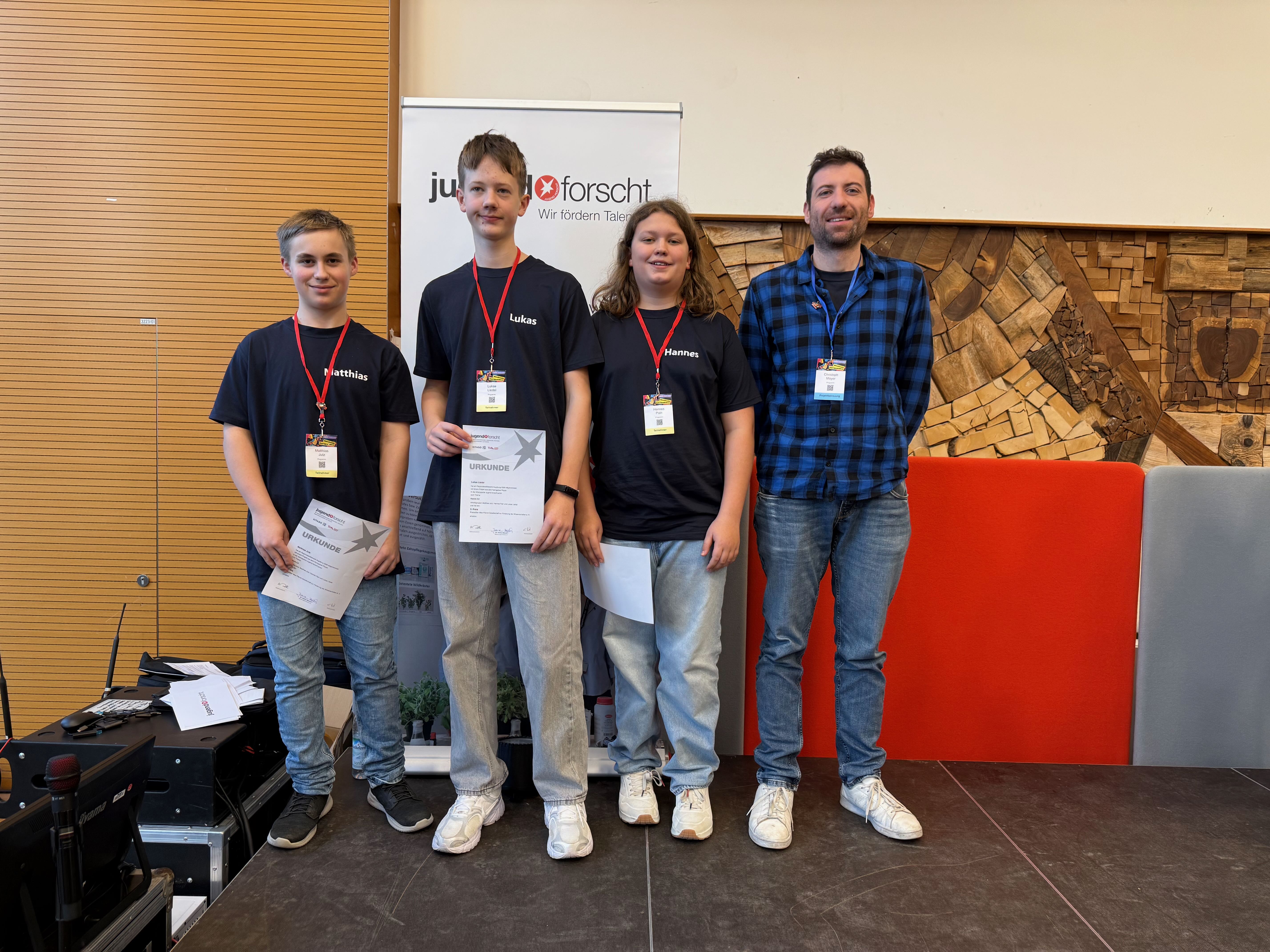 Bild: v.l.n.r.: Unsere Jungforscher Matthias Lutz, Lukas Lieder und Hannes Pain (alle 8a) mit Betreuungslehrkraft Herr Mayer.