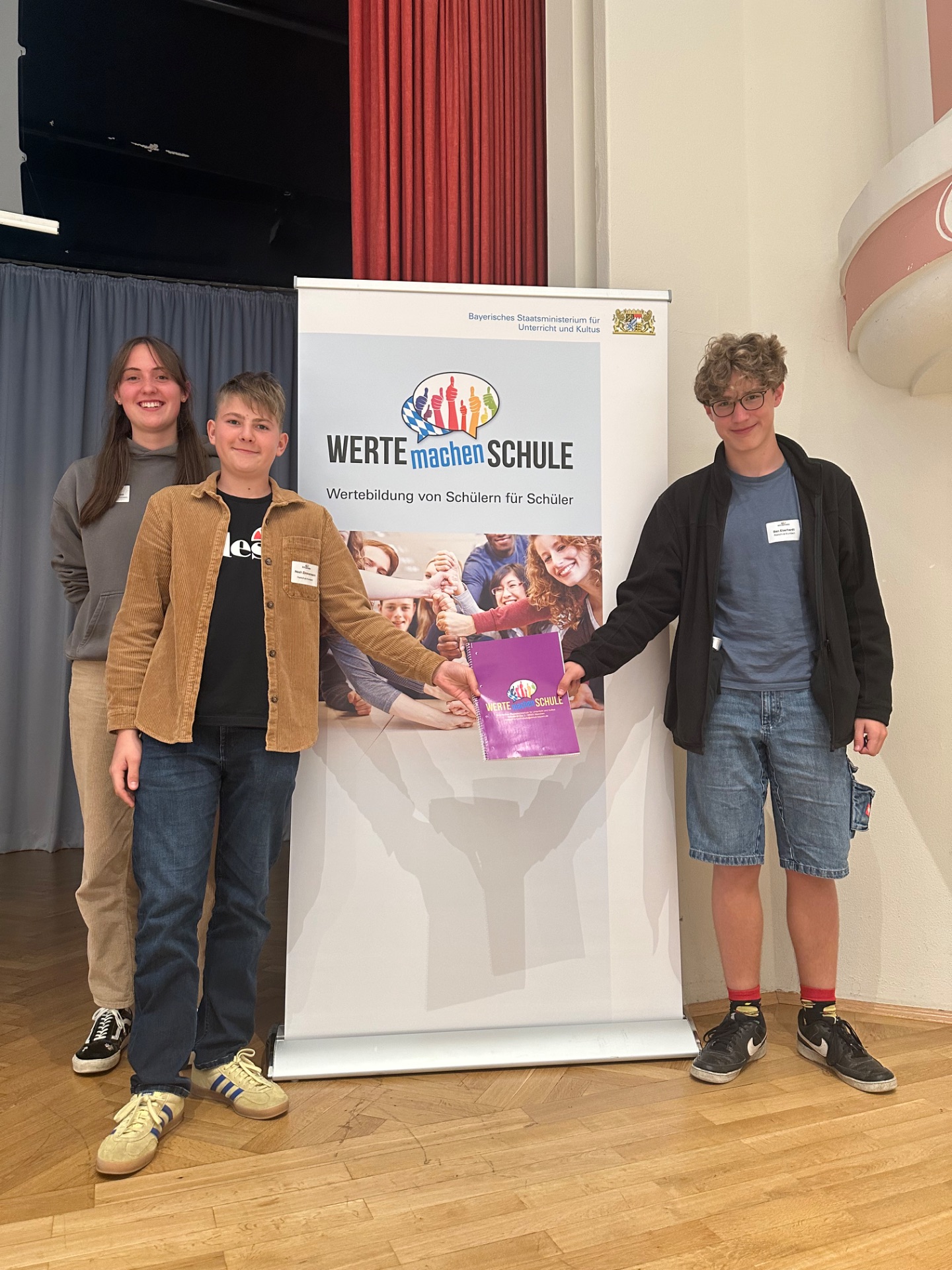 Am 06.10.2025 fand ein Austauschtreffen für Wertbotschafter und Betreuungslehrkräfte vom Bayrischen Staatsministerium für Unterricht und Kultur statt, bei welchem unsere Wertebotschafter Noah Zimmermann 9b und Ben Eberhart 9a teilnahmen. Im Rahmen der Veranstaltung fand ein Impulsvortrag von Dr. Ludwig Spaenle zu Antisemitismusprävention statt und ein bunter Workshop für die Anwesenden. Der informative Tag endete gegen 16.00 Uhr mit einem gemeinsamen Abschluss-Impuls im Hörsaal. Ebenfalls auf dem Bild ist unsere ehemalige Wertebotschafterin Hannah Leopold.